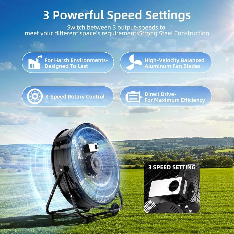 Unleash industrial-grade air power with the XMSJ High-Velocity Drum Fan, delivering 14,000 CFM for maximum cooling and ventilation.